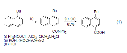 羧基的引入 在alcl3催化下,dpc-cl 可在芳環(huán)上引入一個(gè)羧基。烷基或烷氧基取代的芳環(huán)容易發(fā)生反應(yīng)。產(chǎn)物二基酰胺用堿水解,再酸化可得到羧酸 (式1)[1]。