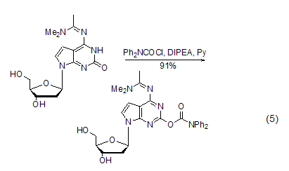 用作寡聚核苷酸合成時(shí)的保護(hù)基 在合成寡聚核苷酸時(shí),鳥嘌呤核苷的堿基容易發(fā)生副反應(yīng),需要加以保護(hù),dpc-cl可以將鳥嘌呤堿基的烯醇異構(gòu)體酰基化而對其進(jìn)行保護(hù),這種方法在合成具有鳥嘌呤堿基和與鳥嘌呤堿基類似的核苷化合物時(shí)[9~12],發(fā)揮著重要作用 (式5)。
